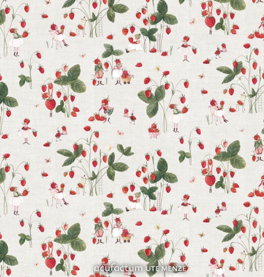 Auf beige strukturiertem Grund entfaltet sich ein fruchtig frisches Spiel aus leuchtendem Rot und sanften Grüntönen, das an sonnige Tage während der Erdbeerernte erinnert. Zwischen üppigen Erdbeerpflanzen begegnen uns kleine Erdbeerwichtel, die die reifen Früchte liebevoll pflücken und behutsam sammeln, während sich die warme Fülle des Sommers in jedem Detail widerspiegelt.
