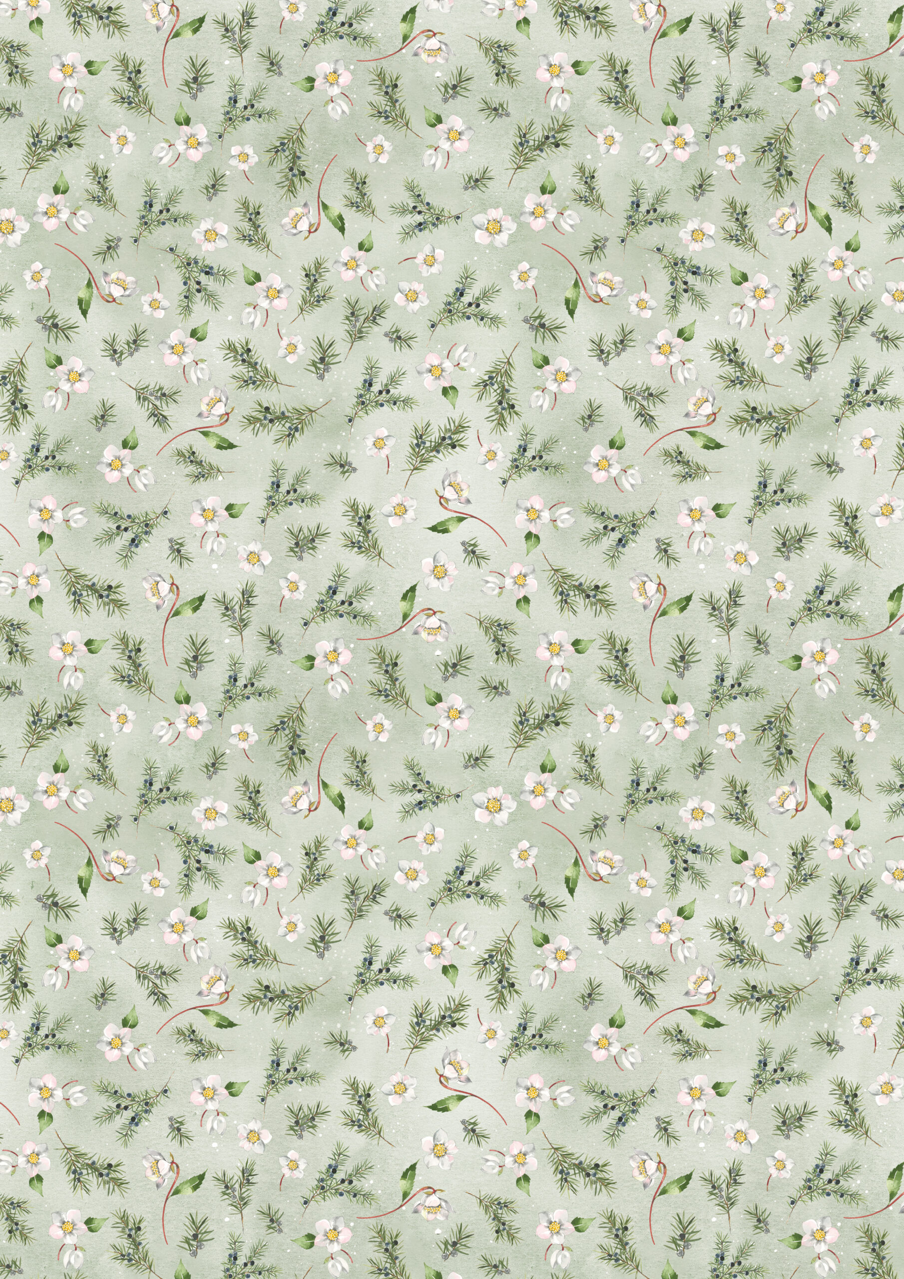 Der Baumwollstoff Mini – Christrose ist eine liebevolle Komposition aus winterlichen Pflanzenmotiven, die wie ein zarter Teppich aus dem Garten eines verschneiten Waldhauses wirken.